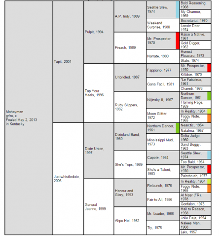 Mohaymen is inbred to the redoubtable Relaunch and his full sister Moon Glitter (thereby providing the Rasmussen Factor of inbreeding to a superior female in their dam, Foggy Note). Moreover, Tapit and Dixie Union have similar influences: Tapit is bred on the Seattle Slew/Mr. Prospector-line cross that also appears in Dixie Union’s dam. So Mohaymen is also inbred to “Slew” and Mr. P., in addition to the ubiquitous Northern Dancer.